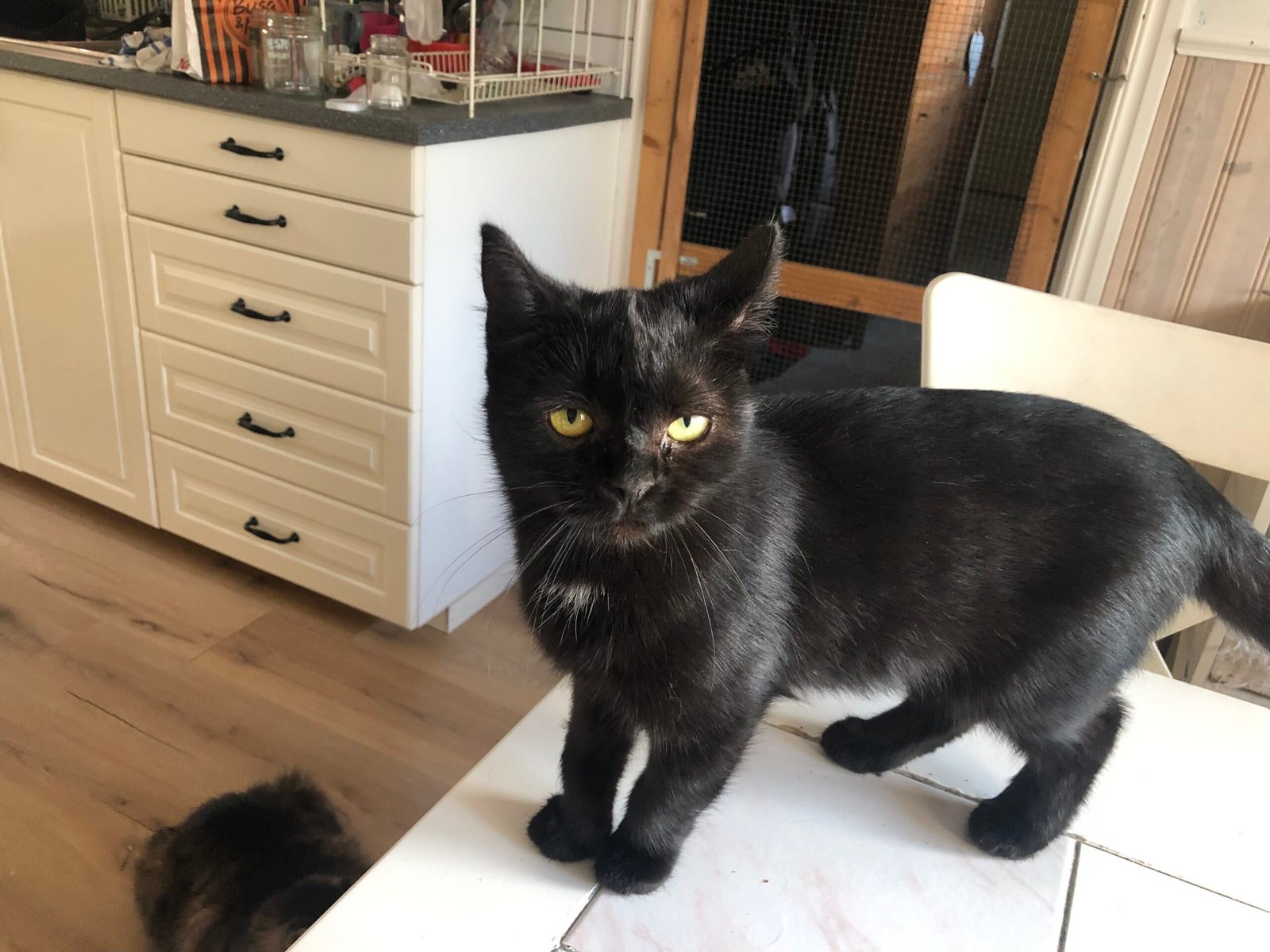 Denna sötnosen heter Elara. Hon är ganska liten, så vi misstog henne först för en unge. Hon har kronisk kattsnuva, men är inte snorig. Ögonen rinner ibland, men hon sköter det för det mesta själv.
