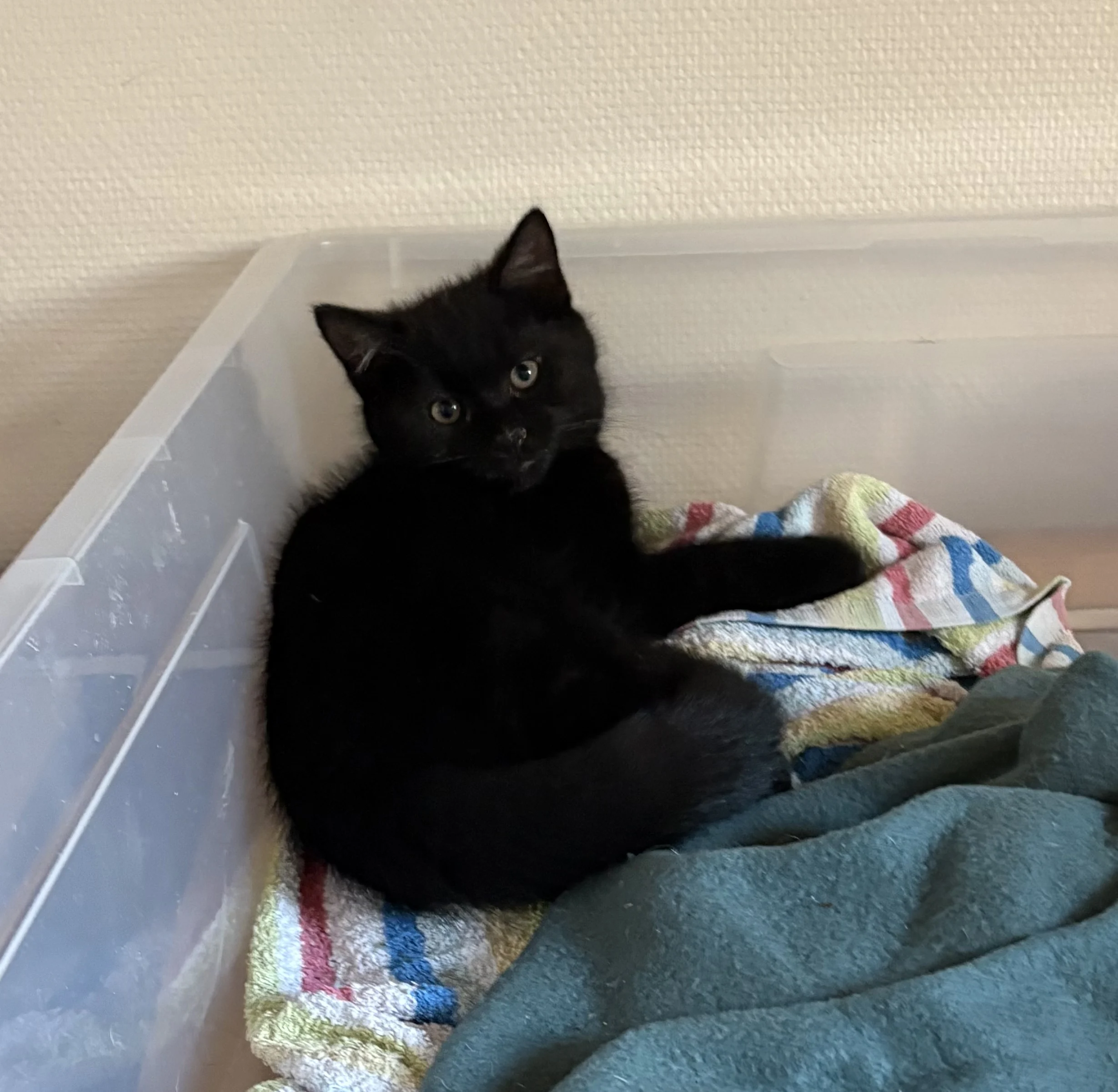 Den här lilla kattungen är full av lekglädje och nyfikenhet – bollar, fjäderleksaker eller prasslande papper, allt är spännande när han upptäcker världen. Han är fortfarande lite blyg och tar nya situationer försiktigt, men med tid och tålamod vågar han mer och mer.