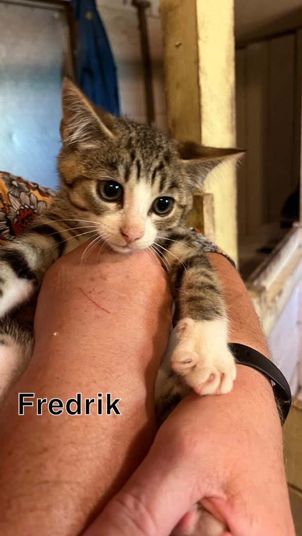 Fredrik föddes i en kull om sex, av en hemlös mamma som valt att lägga dem i ett stall. Fredrik är en väldigt snäll, lekfull och tam kisse.