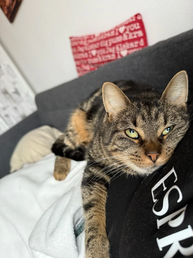 Är gärna med överallt i hemmet och pratar med fåglarna utanför fönstret. Kloklippning går bra så länge man är två en att mysa med och en som klipper. Han nafsar ifrån när han lessnat men biter inte bara varningar.