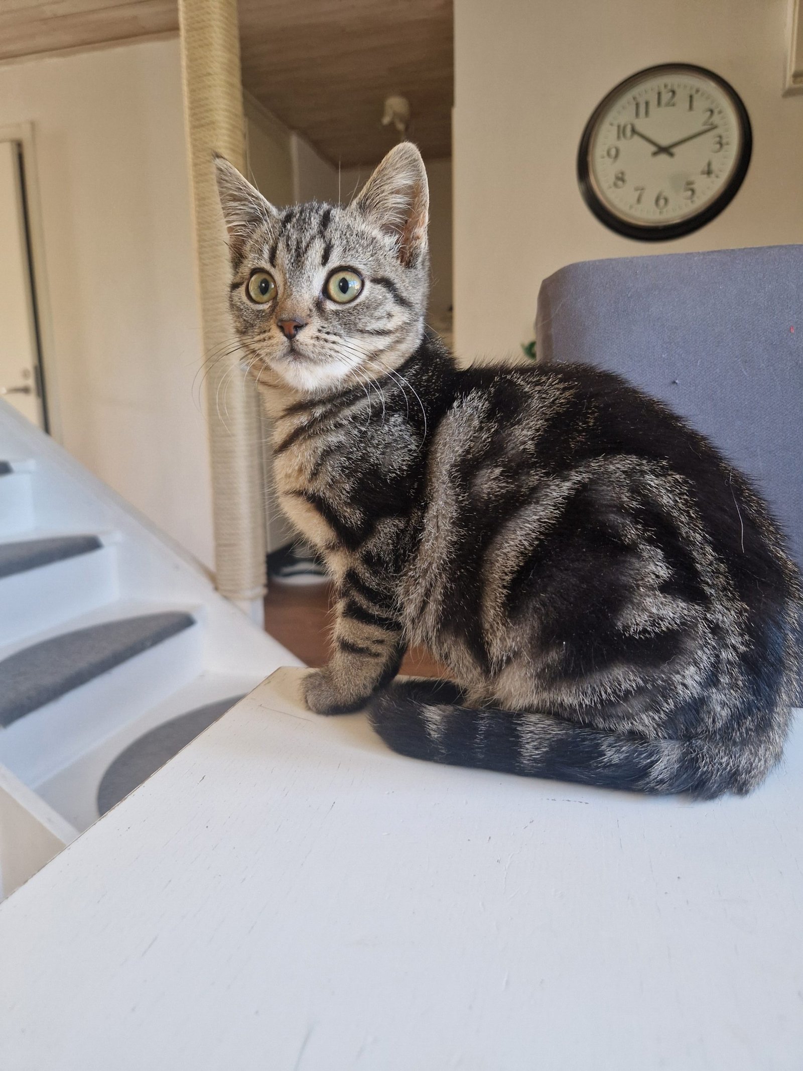 Hildur hittades tillsammans med sin bror på Öland i oerhört dåligt skick, de var båda bara små skelett med skinn på. De hade snuva och ville inte äta. Men nu är Hildur en pigg och busig tjej som är väldigt självständig, ligger gärna lite vid sidan av och busar lite försiktig. Hon är också väldigt matglad!