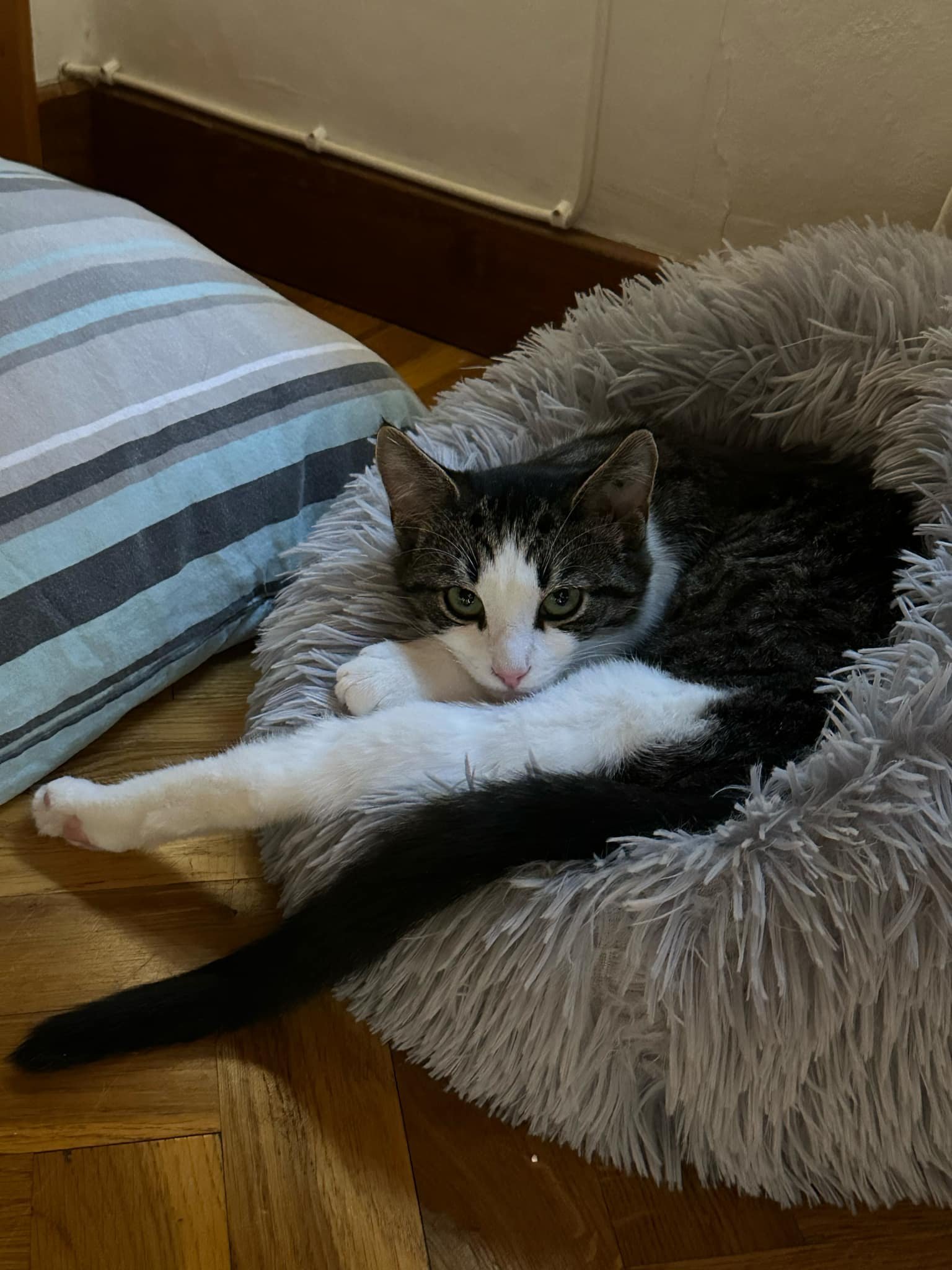 Houndini älskar o busa o leka. Väldigt nyfiken och lite försiktig tjej. Ibland kan stödhemmet ta henne utan problem. Går att klappa. Otroligt gullig och gosig när stödhemsmatte är nära och kommer fram och ska nosa, slicka på bar hud. Hon vill mer än hon egentligen vågar. Nyfiken. "Pratar" lite med stödhemsfamiljen. Vill ha en kattkompis I hemmet. Gärna brodern Bozo. Kommer överens med familjens övriga katter. Van vid äldre barn. Rumsren.