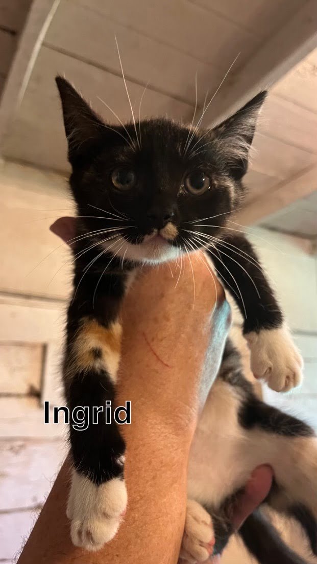 Ingrid föddes i en kull om sex, av en hemlös mamma som valt att lägga dem i ett stall. Ingrid är en väldigt snäll, lekfull och tam kisse.