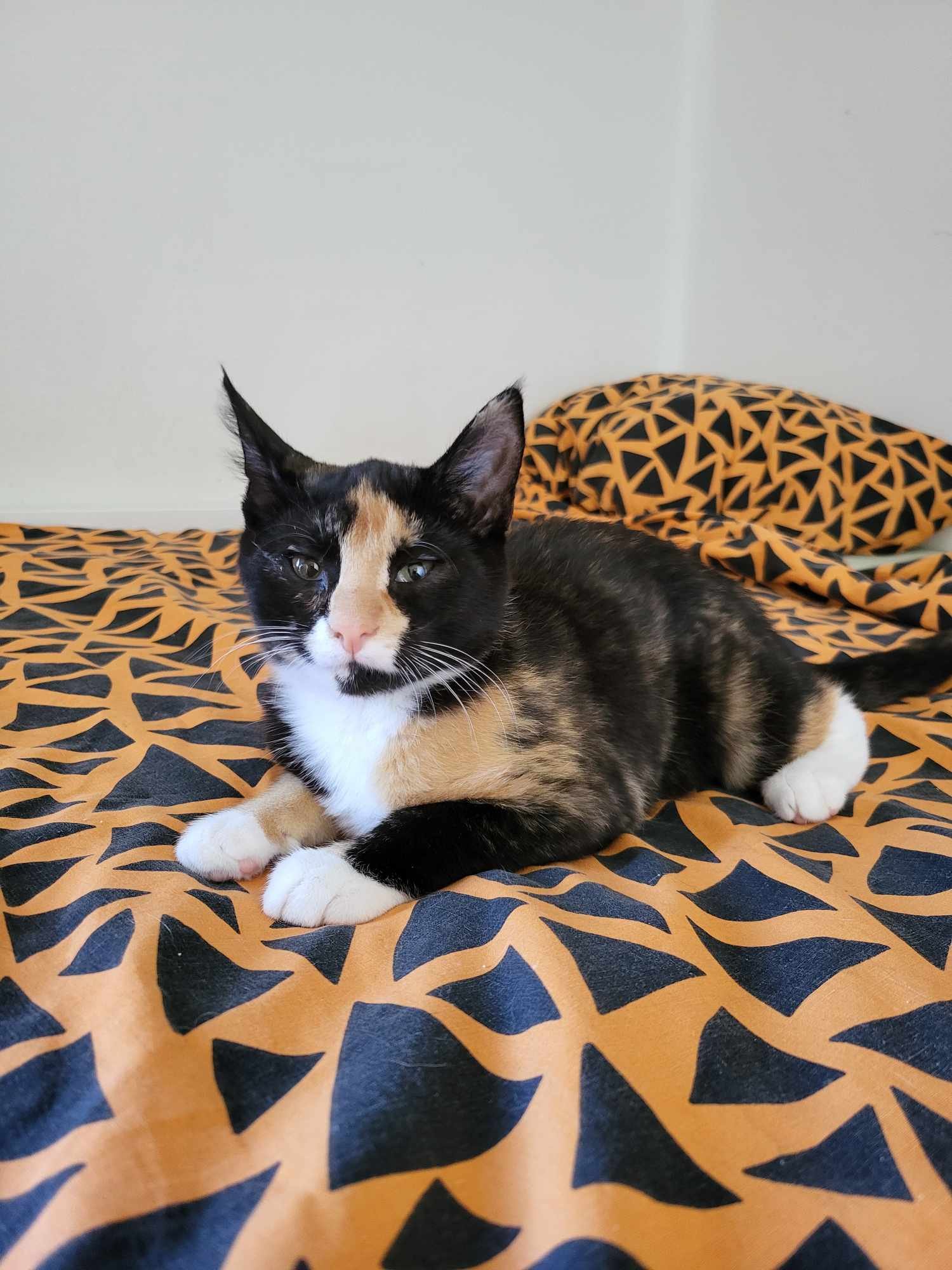 Kelphie hittades ensam på Öland. Hon är en pigg, lekfull och nyfiken kattunge. Hon är väldigt kelen och klappbar, och behöver en kattkompis i det nya hemmet.