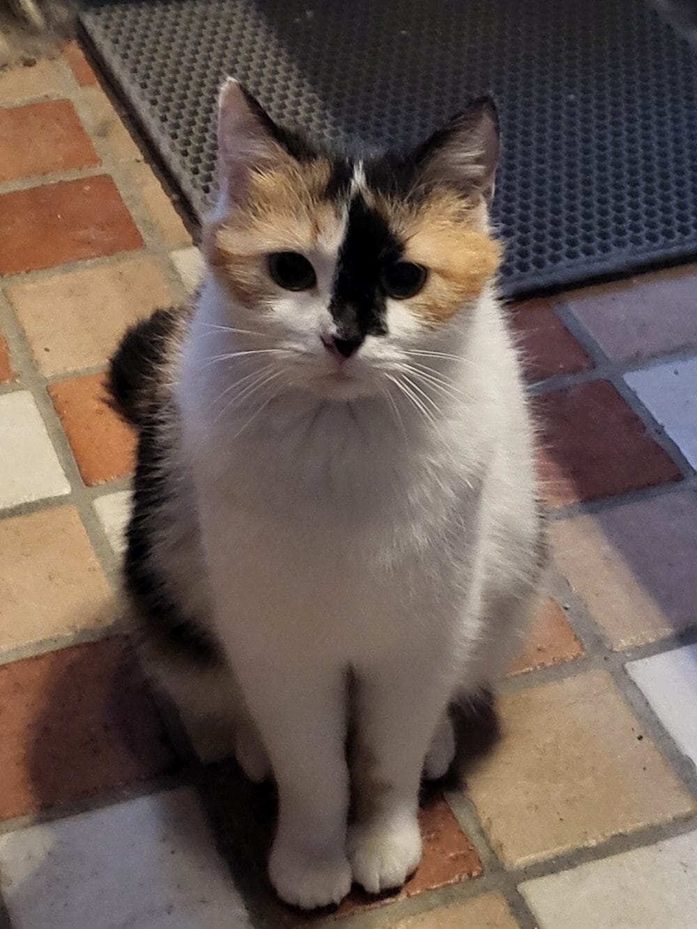 Kitty kom till stödhemmet efter att ha hittats i Gullabo i januari 2024. Hon är en försiktig dam och behöver tålamod för att komma nära. Hon avskyr att fångas och lyftas, men har kommit så långt att hon stannar upp om stödmatte ropar hennes namn. Hon älskar kattgodis och kommer nära och tillåter sig att bli klappad emellanåt, men är fortfarande mycket blyg. Hon behöver sin "bror" Thorax som kom till hemmet samtidigt och vill flytta tillsammans med honom