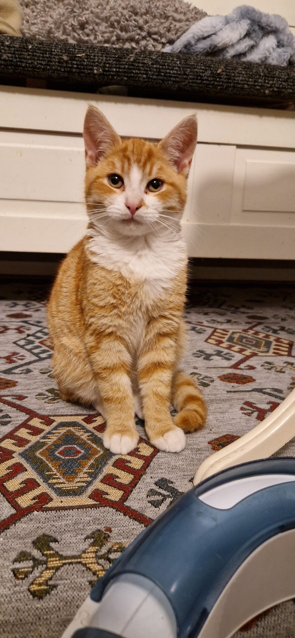 Merida är ca 6 månader, en oerhört lugn och rar tjej. Hon gillar att leka med sin kompis hon fick med sig, och är super snäll mot stödhemmets andra katter.