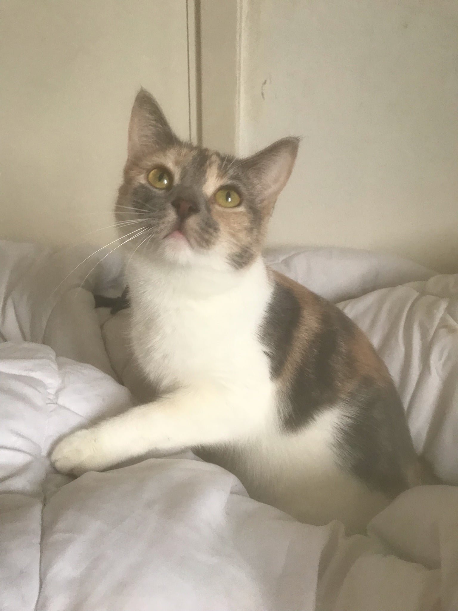 I stödhemmet är hon snäll, gosig och klappbar. När man klappar henne för mycket nafsar hon i fingrarna. Hon kan inte hantera känslorna, och att få så mycket kärlek. Med tid så blir beteendet mindre. Det går bra att lyfta henne, och hon älskar att ligga under täcken och filtar. Hon äter det mesta, popcorn är en favorit. Pinglan vill ha ett hem med inte för små barn. Hon är van vid andra katter och vill gärna ha en kattkompis.
