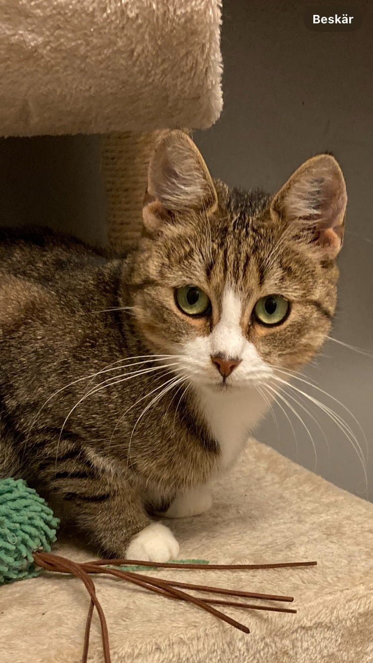 Prudence fångades in på soptippen för ungefär 2 månader sedan. Där levde hon med många katter. När hon kom till stödhemmet var hon skygg, osäker o rädd. Hon gjorde stora framsteg snabbt i stödhemmet. Idag är hon mycket kelen o kryper gärna upp i stödmattes knä. Hon är social, pigg o glad katt. Hon älskar bus o lek och är rumsren. Hon är väldigt matglad och äter allt. Hon trivs med sin kompis som också är en stödhemskisse, så hon vill nog ha en lekkompis.