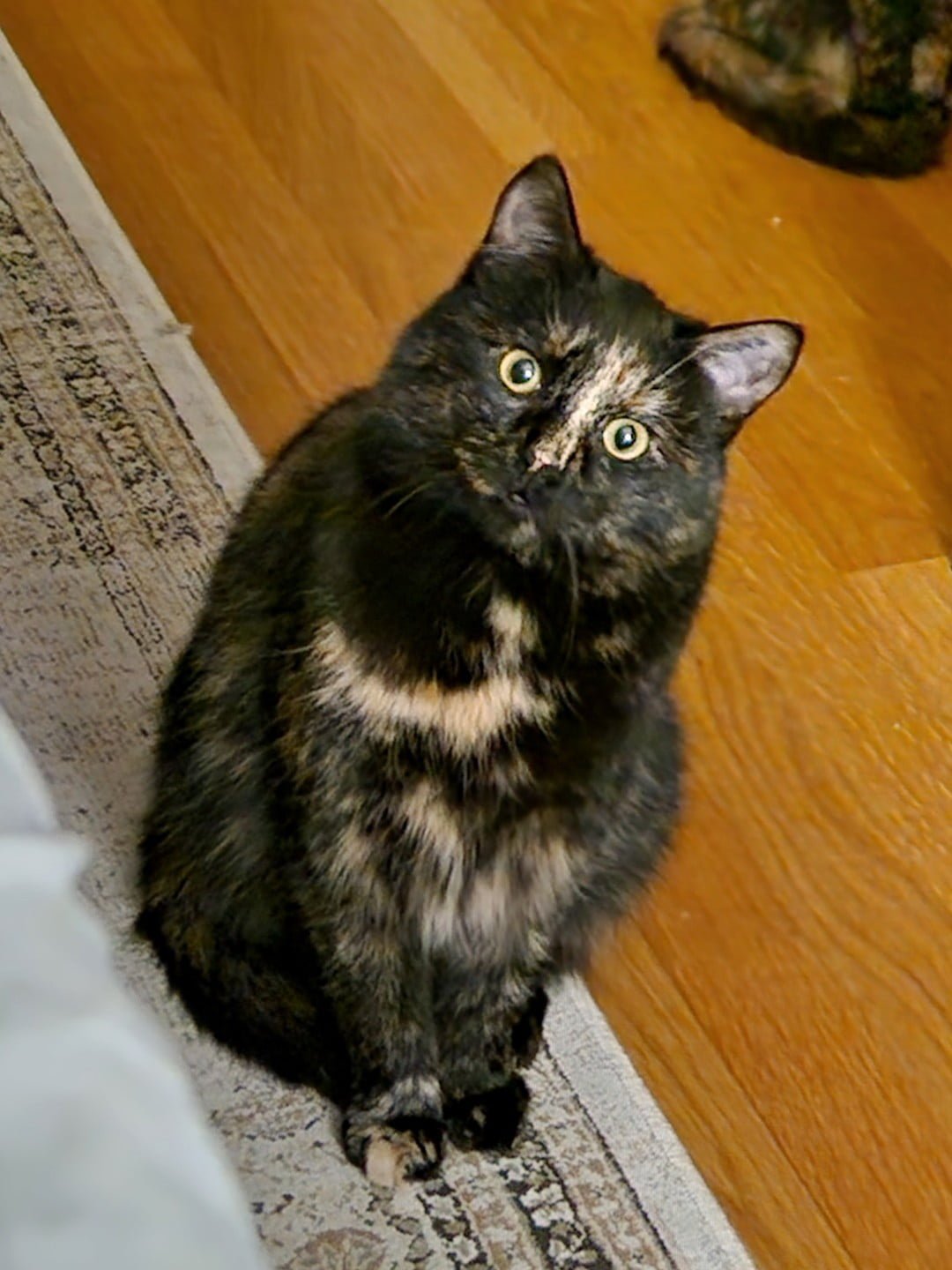 Simo är den nyfiken och hon kan inte motstå att leka och glömmer lite att hon är blyg. Hon har utvecklats otroligt mycket sedan hon kom till stödhemmet, nu sover hon i stödmattes säng och kommer fram och vill bli klappad.