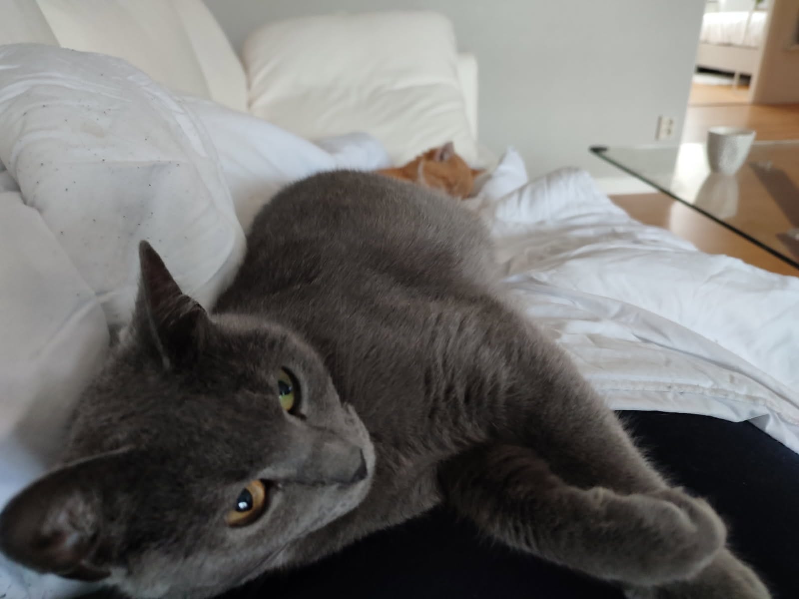 Hon är en tam o kelen katt. Hon älskar sin kattkompis i stödhemmet, så hon vill gärna ha en kattkompis i sitt för alltid hem. De leker o busar. Sky hoppar gärna upp i soffan när stödmatte sitter där o vill ha lite gos. Sover i stödmattes säng. Kommer det barn springer hon först o gömmer sig, men kommer fram efter en stund. Van vid hund. Rumsren.