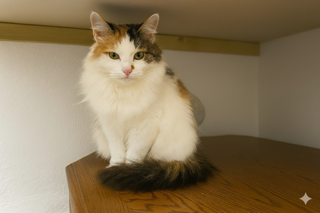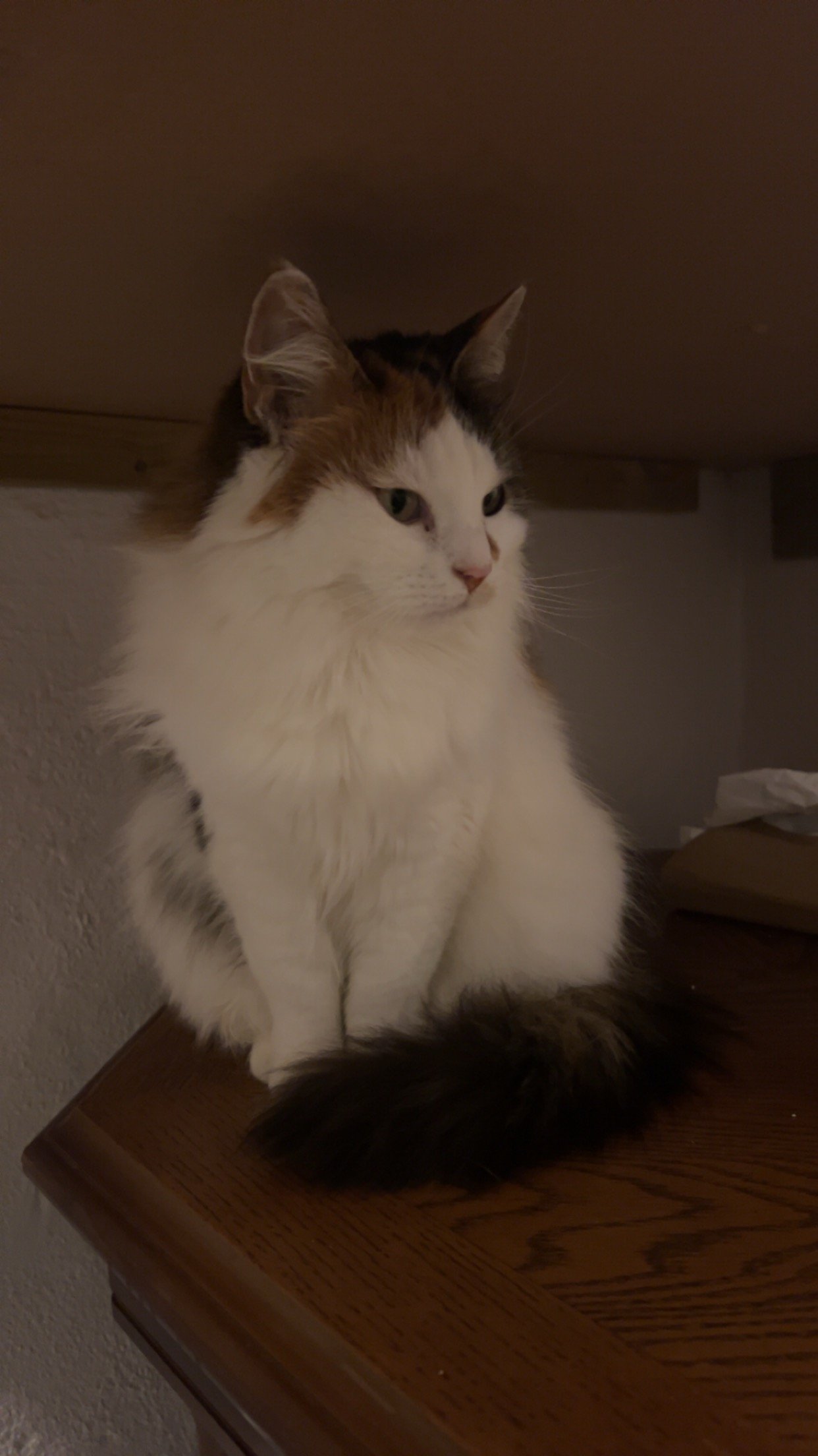 Hon var lite blyg i början när hon kom till stödhemmet. Hon har blommat ut nu. En pratglad tjej. En pigg o busig kisse. Gillar att gosa o vill bli klappad. Men kan gå undan en stund när hon tycker det blir för mycket. Rumsren. Bor med en kompis som kom från samma ställe. De funkar jätte bra ihop.