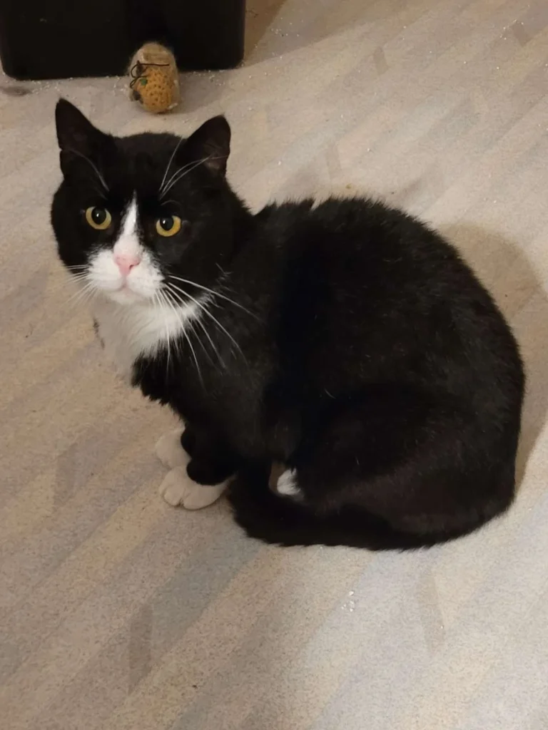 Tjechov hittades på södra Öland där ingen ville kännas vid honom. Han är väldigt blyg och lämnar helst inte sitt rum i stödhemmet, men älskar att bli klappad och buffas med huvudet. Stor och snäll som en björn. Stödhemmets son brukar klappa honom och mata honom med godis.
