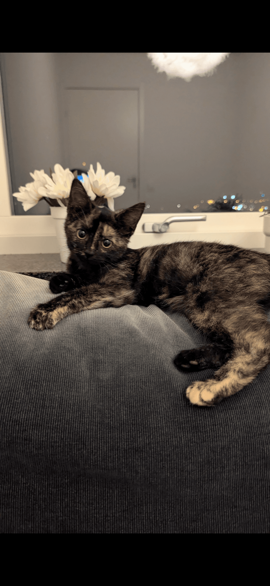 Wendy fångades in på Öland ett ärende där det fanns många katter. Alla var tama o friska. Wendy är en pigg, nyfiken o lekfull liten kattunge. Hon älskar att bli klappad o gosad med.